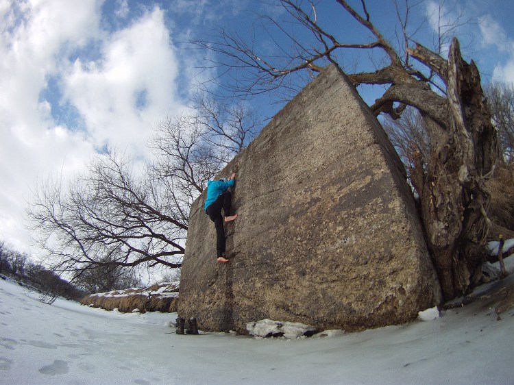 Holy unique adventures! This trip was FREEDOM! I can honestly say that I have never walked around barefoot on a winter tree camping trip and I have never climbed an old wall of unknown age as if it was a stellar boulder route. I call the route “Naked Feet” and rate it V1.