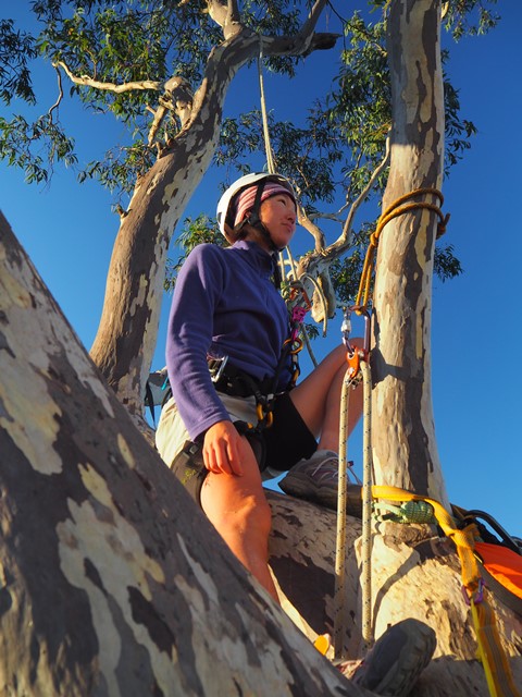 Here is what Stephanie sent with her photos: “I’ve done about 9 more tree camps since then (all solo) but the latest one I did on the weekend was with my partner, Pete. We found this amazing lone tree near the edge of the escarpment in the Blue Mountains with incredible views. He brought his drone and got a shot of us in the tree with the views in the background. Thought you might appreciate the photo. You’ll notice that we’re really not that high off the ground, maybe 5m, but that was as high as Pete was willing to go as he’s not great with heights. He did really well to get into the tree and I think he actually enjoyed himself once he was safely cocooned in his hammock!”